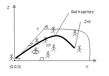 Each player has an individual starting position (xo, yo) he always returns to before a new ball is hit. The players, each starting to run as soon as the ball is hit towards the correct position where the ball will eventually touch the ground, all theoretically have a chance to catch the ball. So you must verify all of them since the distance they can run is dependant on their individual speed. Well, after all, we assume that these players always run as fast as possible given the good paychecks they are given, so the variation of their position is always the same throughout the match, e.g. they run at the same speed.