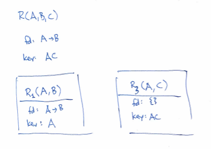 We started with a retake of one of the problems from last time: we want to normalize the following relation into BCNF: