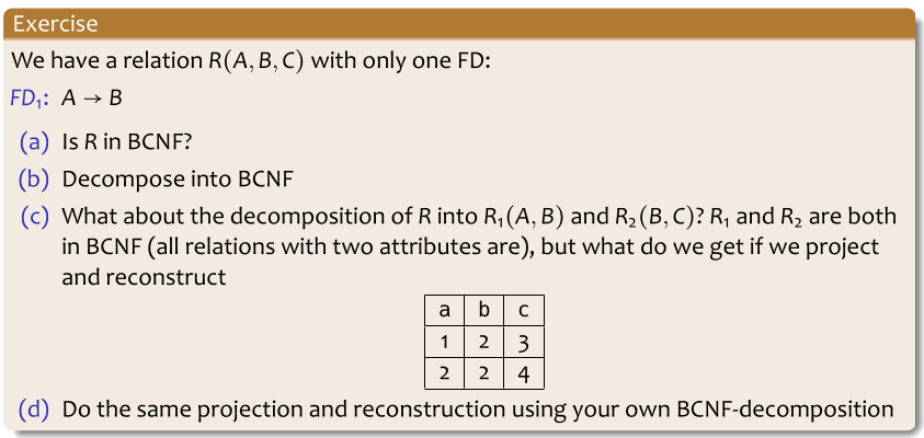We then talked about reconstruction – the most important aspect of the algorithm we use for normalizing into BCNF, apart from producing relations in BCNF, is that we can easily reconstruct our original table by joining our new tables using the left hand sides of the FD's we've used to deconstruct.