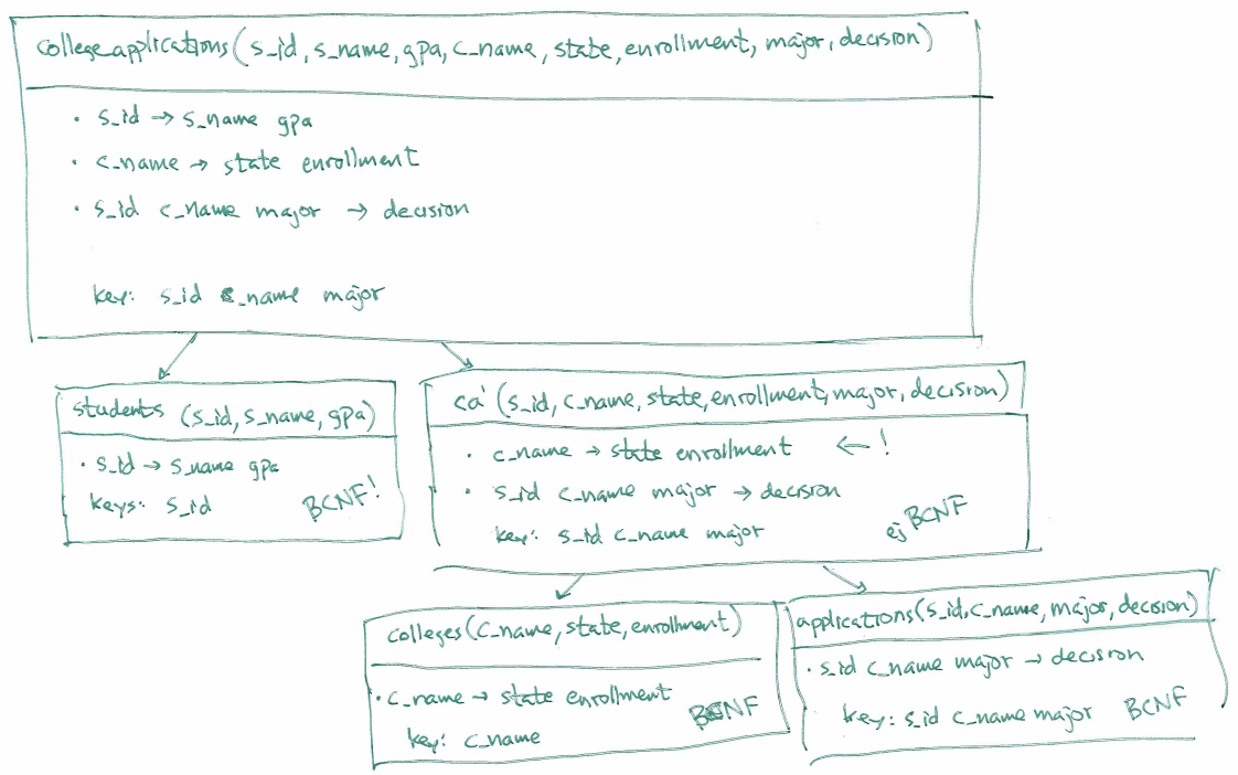 Near the end, I started to normalize the student application database we've seen since lecture 2, we started out with one big table, and identified the functional dependencies.